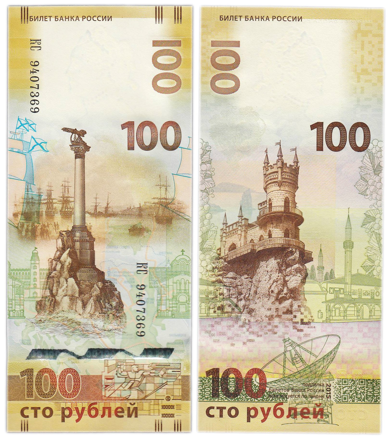Воссоединение Республики Крым и города Севастополь с Российской Федерацией в 2014 году было решено отметить не только монетами, но и купюрой, которая продолжила серию памятных купюр, начатую сторублёвкой "Сочи-2014". В оборот банкнота поступила 23 декабря 2015 года. Такой долгий срок объясняется тщательной проработкой рисунка, учитывающей как исторические вехи Крыма, так и его современные особенности. Тираж выпуска составил 20 000 000 экземпляров.