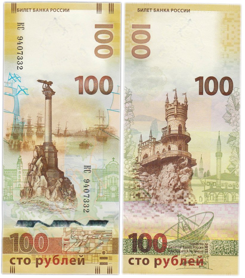 Воссоединение Республики Крым и города Севастополь с Российской Федерацией в 2014 году было решено отметить не только монетами, но и купюрой, которая продолжила серию памятных купюр, начатую сторублёвкой "Сочи-2014". В оборот банкнота поступила 23 декабря 2015 года. Такой долгий срок объясняется тщательной проработкой рисунка, учитывающей как исторические вехи Крыма, так и его современные особенности. Тираж выпуска составил 20 000 000 экземпляров.