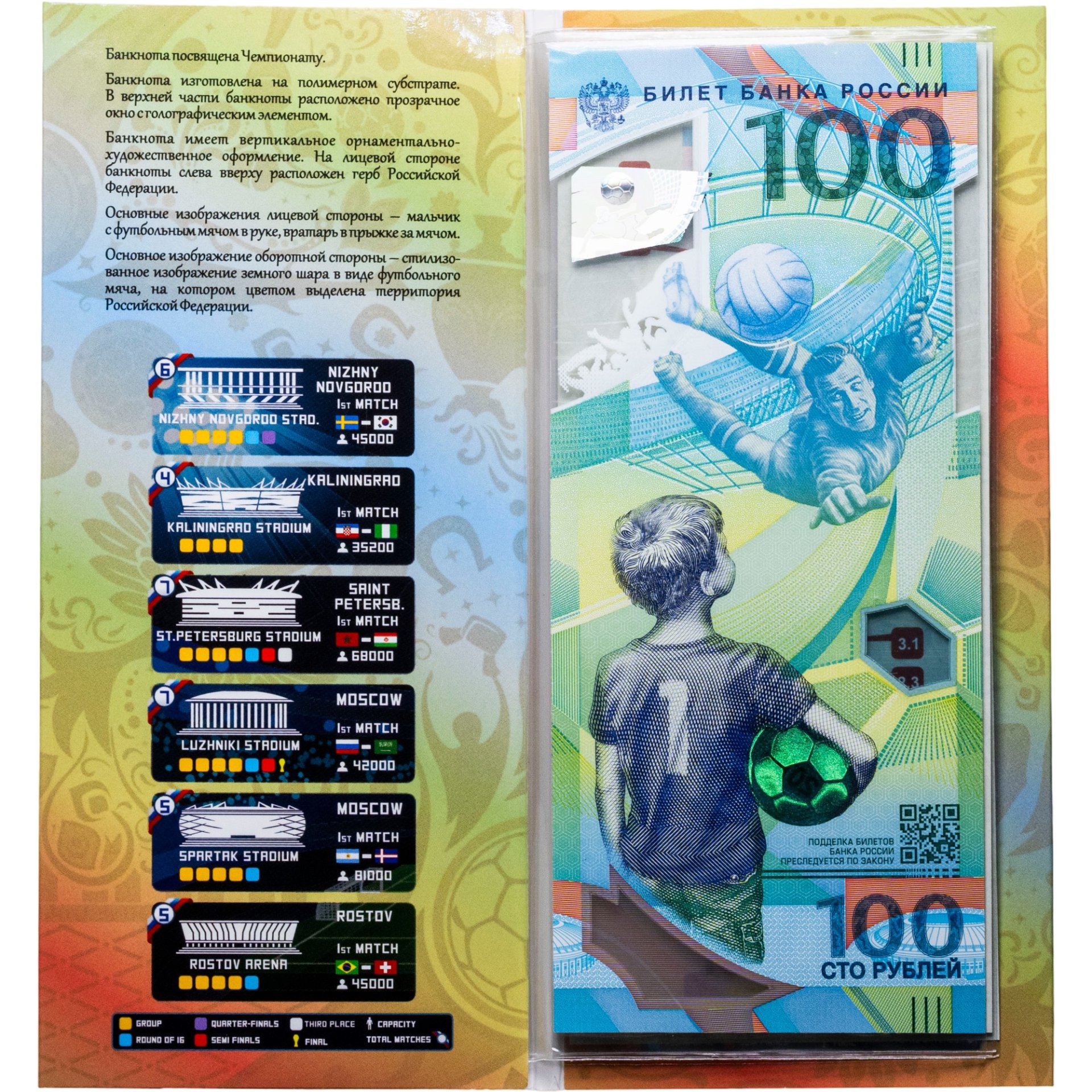 В презентационных целях часть тиража выпущена в подарочной упаковке. Те же, кому представитель спецзаказа не достался, особо не переживают. Для коллекционеров выпущен целый арсенал всевозможных альбомов с посадочным местом для этой необыкновенной купюры. Наиболее ценным считается иметь в наличии альбом, где представлен полный комплект. Кроме сторублёвки туда входят и одиннадцать монет номиналом 25 рублей (7 обычных с датами 2011-2014 и 4 цветных в блистерах). Но любой желающий может расширить пределы коллекции, посвящённой сочинской олимпиаде, приобретя монеты по теме из золота и серебра, включая набор из инвестиционных монет, имеющих, как и банкнота, прямоугольную форму. Наш магазин предлагает абсолютно новые банкноты из банковской упаковки (номер банкноты на скане может отличаться от той которую Вы получите).