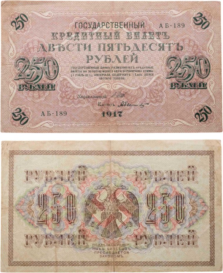 с 8 сентября этого же года выпускается в обращение денежный знак Временного правительства Государственный кредитный билет номиналом 250 рублей. В связи с тем, что у правительства не было времени на разработку образцов с новой революционной символикой, было принято решение использовать наработки планировавшегося выпуска банкнот, заказанных Монгольским национальным банком в 1916 году, но не поступивших в обращение. За основу кредитного билета номиналом 250 рублей был взят проект билета Монгольского национального банка номиналом 3 рубля. Был внесен ряд изменений в рисунок и цвет билета, а на оборотной стороне изображен фрагмент утвержденной печати - двуглавый орел без регалий, наложенный согласно описанию, на геометрический орнамент – символ «Хас».