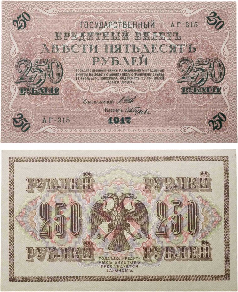 250 рублей 1917 Управляющий- Шипов, Кассир- Ив.Гусев