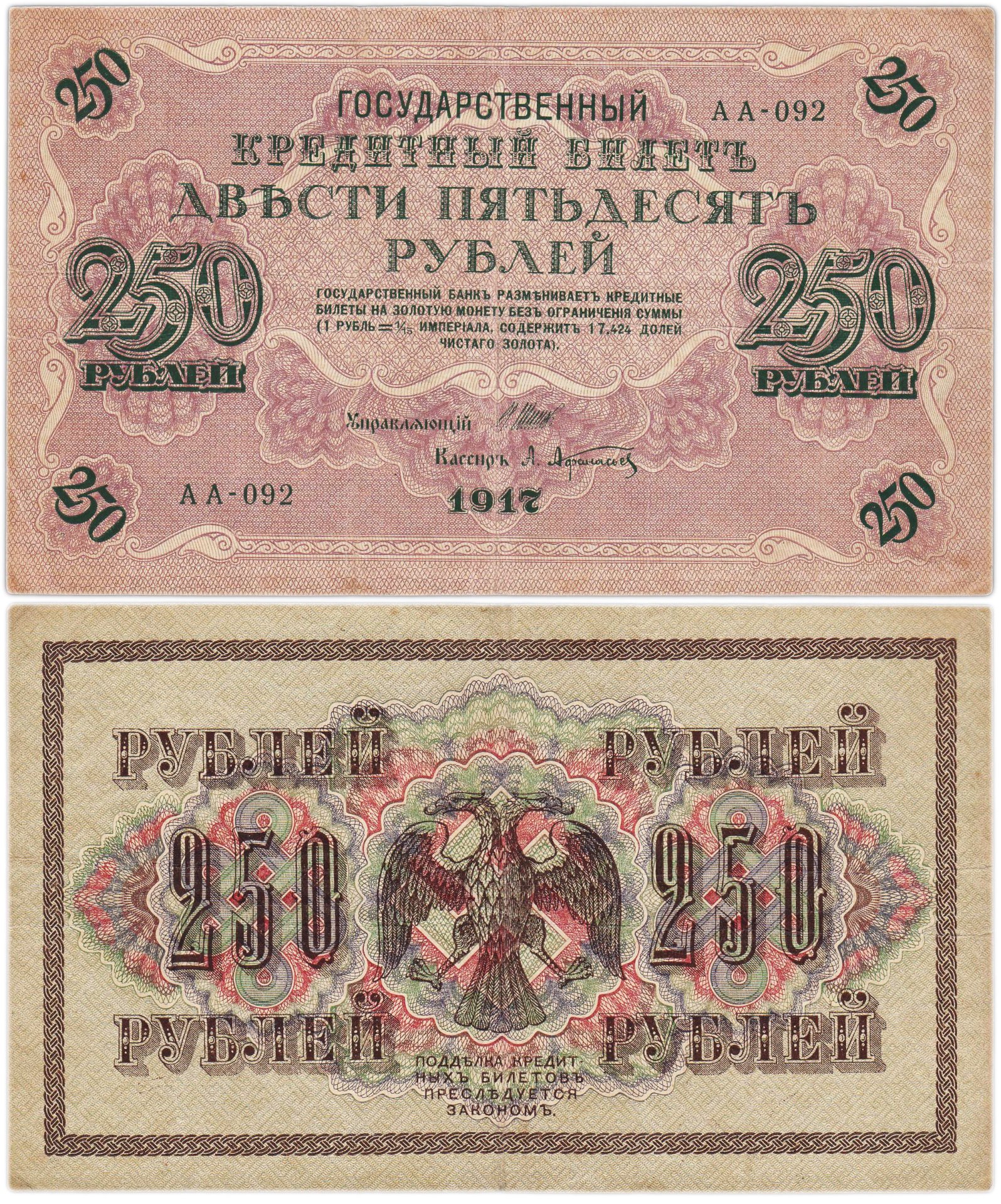 250 рублей 1917 управляющий Шипов, кассир Афанасьев