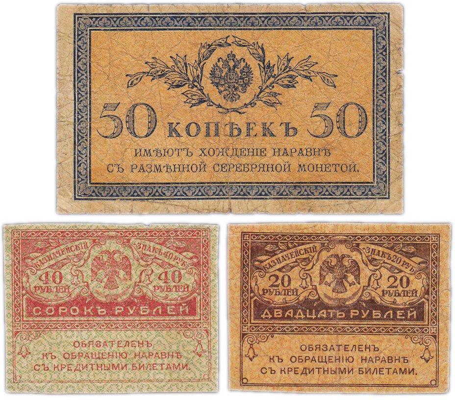 Набор из 3 банкнот года 50 копеек и 20, 40 рублей "Керенка" 1915-1917