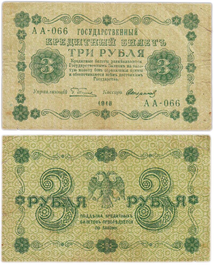 3 рубля 1918 управляющий Пятаков, кассир Стариков