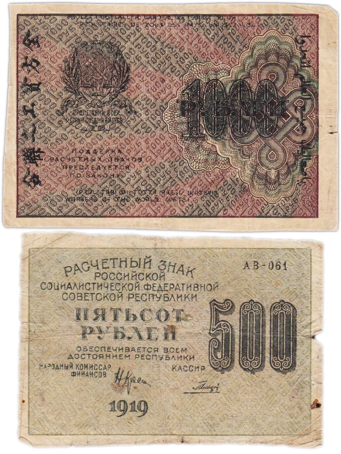 Дизайн купюр 1920 и 1919 годов выпуска был незамысловатым — исключение составили разве что банкноты с номиналами от 100 рублей. Здесь девиз «Пролетарии всех стран, соединяйтесь!» был переведен сразу на семь языков мира, а лицевая сторона банкноты содержала пояснительную надпись, подписи комиссара финансов и кассира. Размер 10-тысячной купюры был гигантским: 175 на 125 миллиметров.