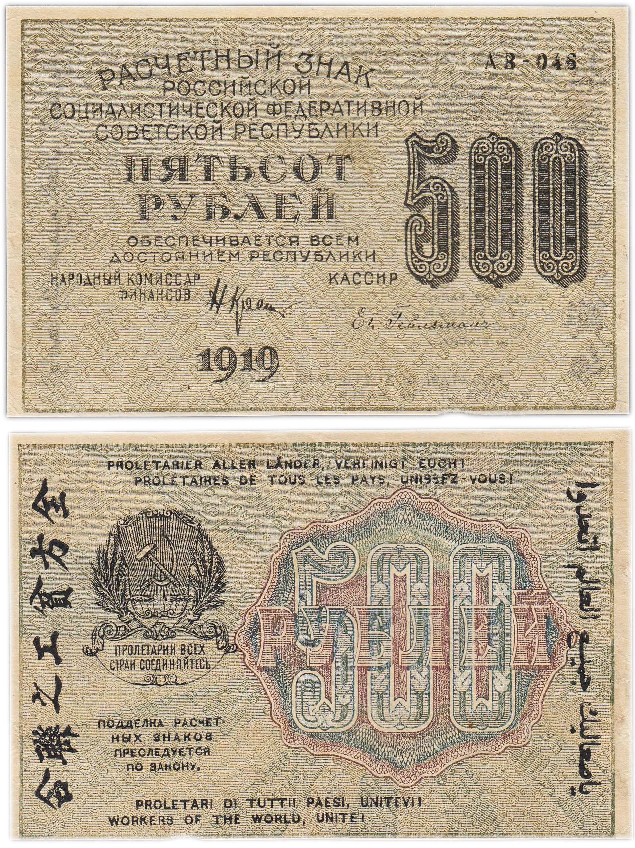 500 рублей 1919 кассир Гейльман, водяной знак "Связанные (толстые) везды" Пермская фабрика ГОЗНАК