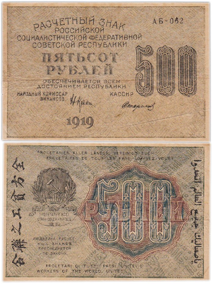500 рублей 1919 кассир Стариков, водяной знак "Связанные (толстые) везды" Пензенская фабрика ГОЗНАК