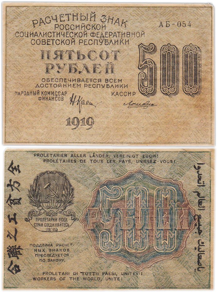 500 рублей 1919 кассир Лошкин, водяной знак "500" вертикально Пензенская фабрика ГОЗНАК