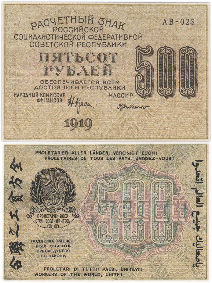 500 рублей 1919 кассир Де Милло, водяной знак "500" вертикально Пермская фабрика ГОЗНАК