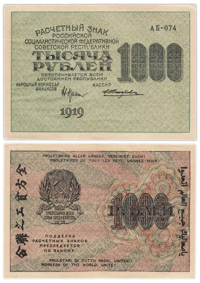 РСФСР 1000 рублей 1919 наркомфин Крестинский, кассир Жихарев, водяной знак "1000"