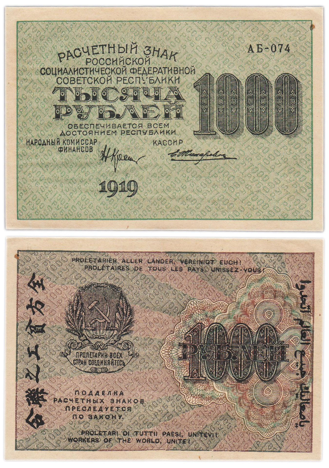 РСФСР 1000 рублей 1919 наркомфин Крестинский, кассир Жихарев, водяной знак "1000"