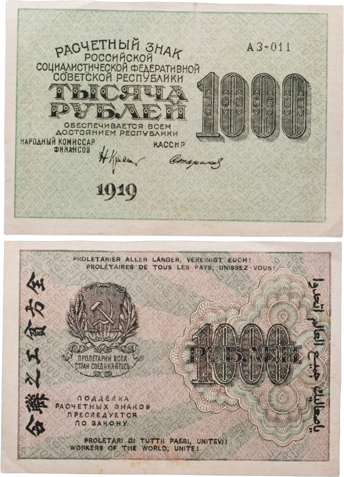 Купить РСФСР 1000 рублей 1919 наркомфин Крестинский, кассир Стариков, водяной знак "1000"
