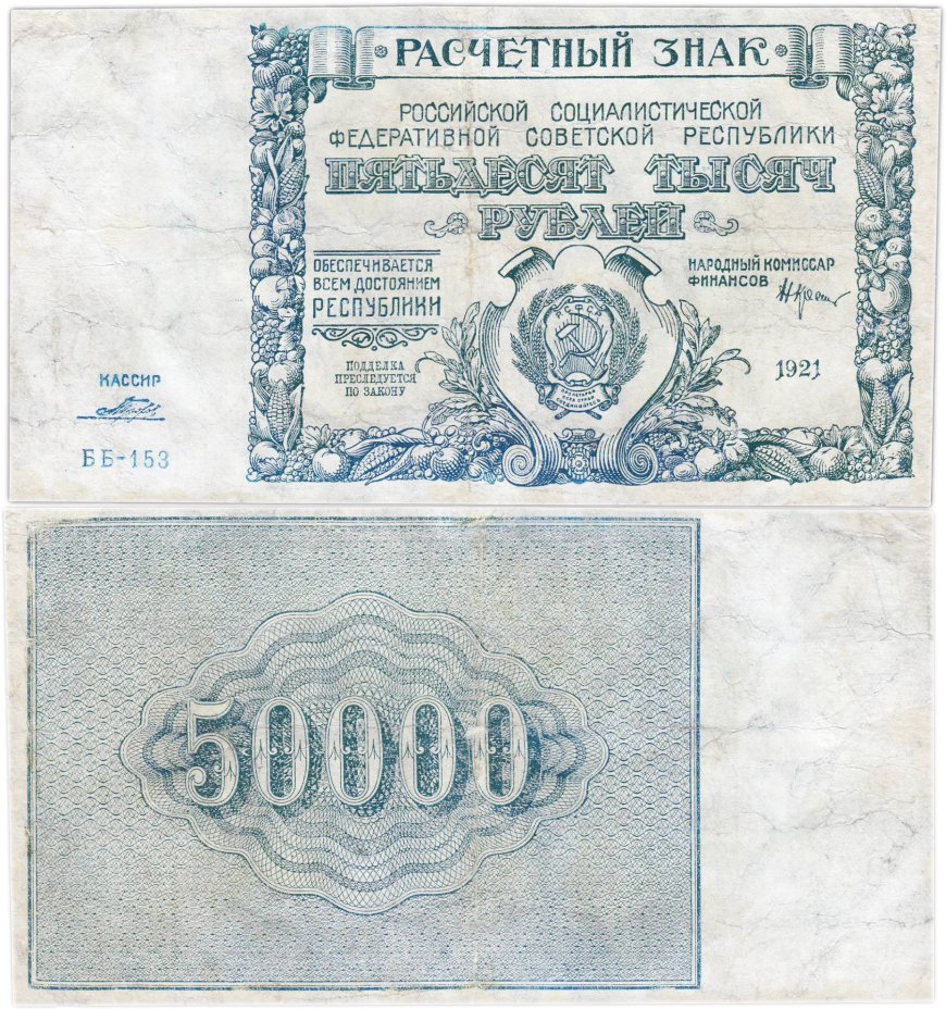 Купить 50000 рублей 1921 наркомфин Крестинский, кассир Порохов