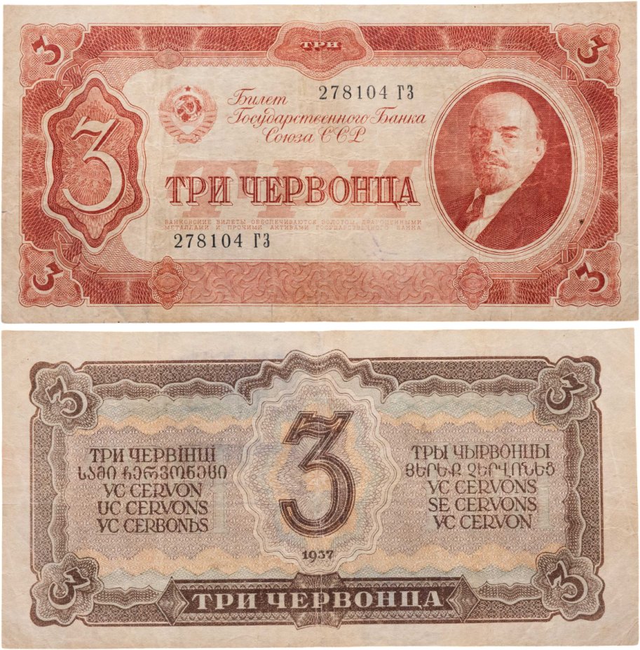 3 червонца 1937 тип литер Большая/Большая (В.И. Ленин)