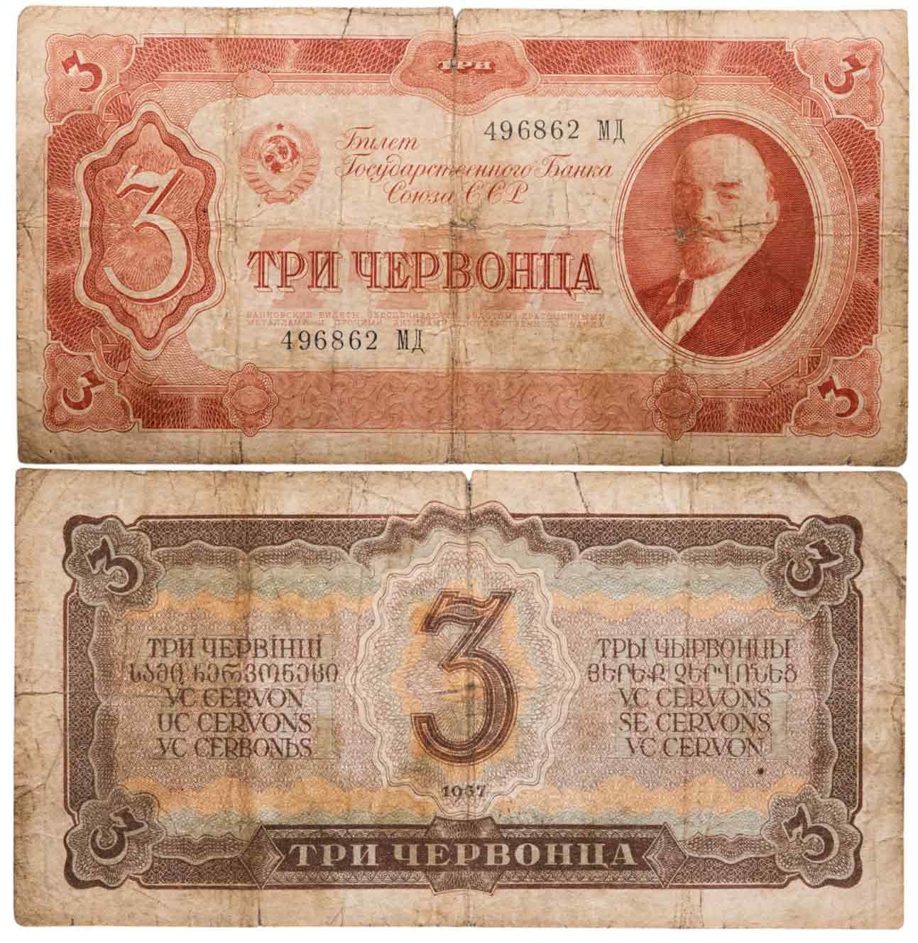 Купить 3 червонца 1937 тип литер Большая/Большая (В.И. Ленин)