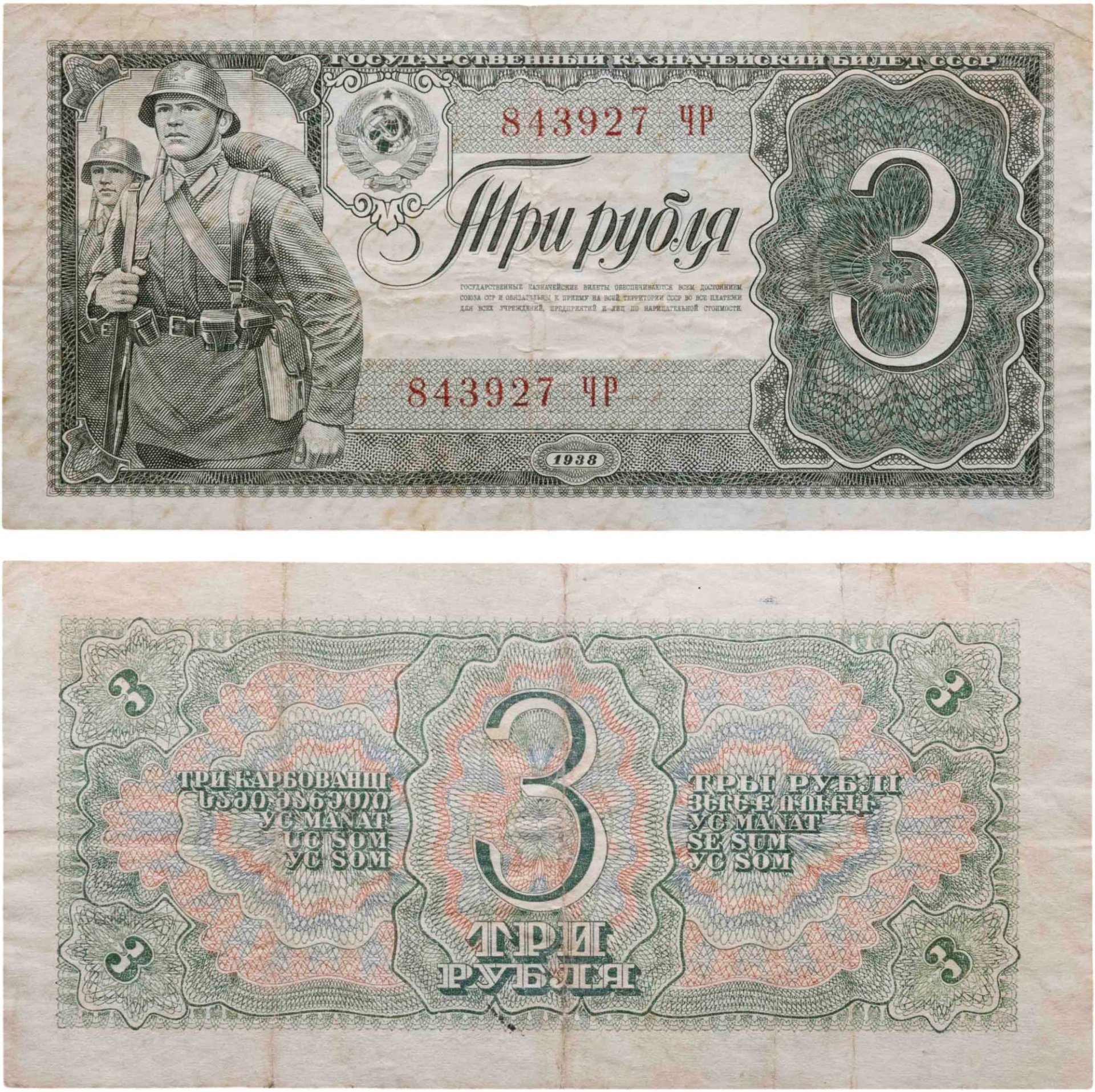 3 рубля 1938 тип литер Большая/Большая, серия ЧР