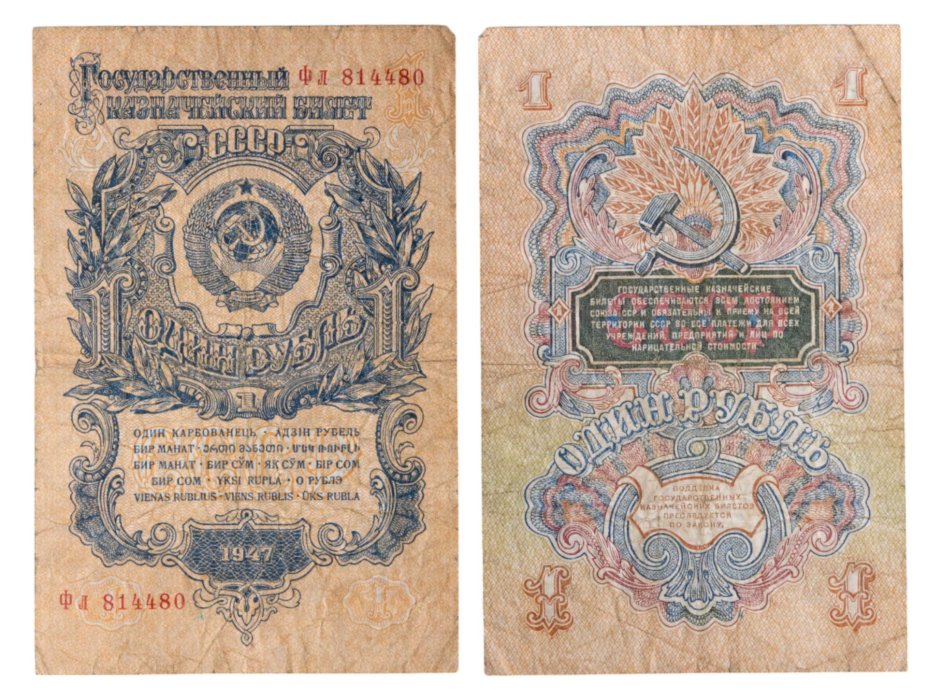 1 рубль 1947 16 лент в гербе, тип литер маленькая/маленькая, серия фл