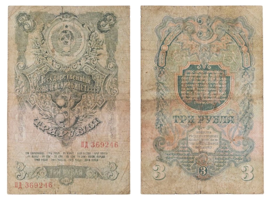 3 рубля 1947 16 лент в гербе, тип литер Большая/Большая, серия ПД