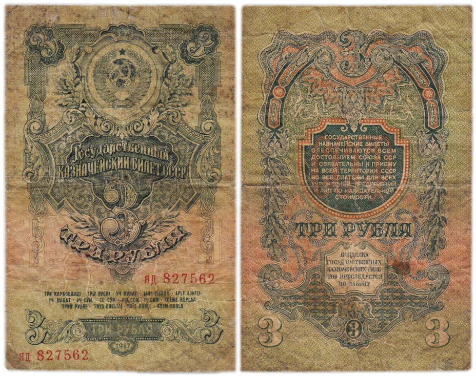 3 рубля 1947 (16 лент в гербе) 1-й тип шрифта, тип литер маленькая/маленькая В47.3.4А по Засько