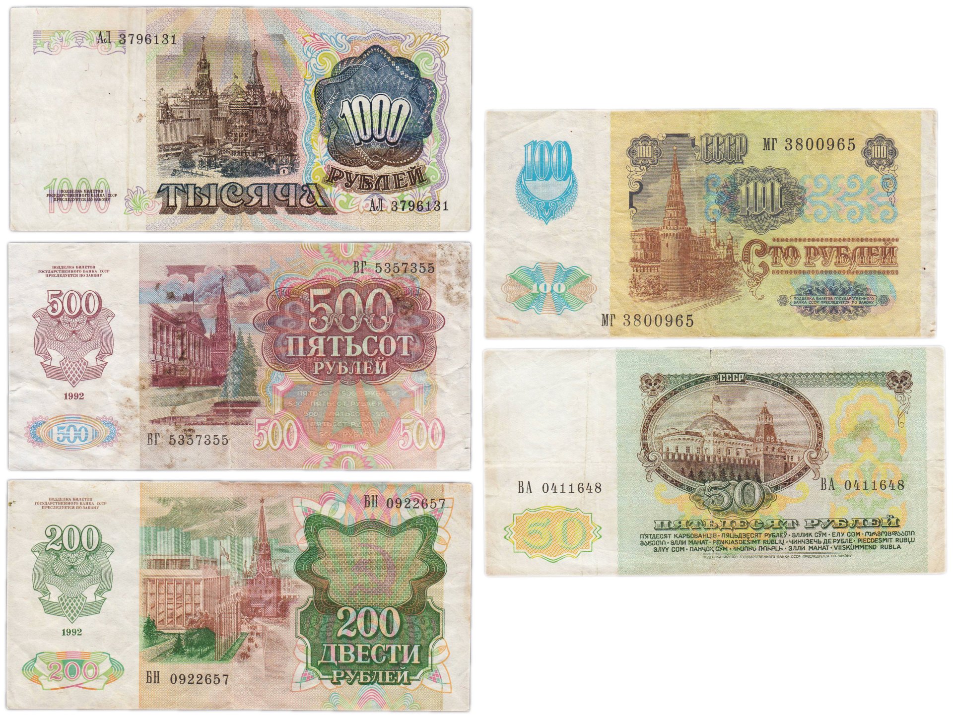 Набор из 5 банкнот 50, 100, 200, 500, 1000 рублей 1991-1992