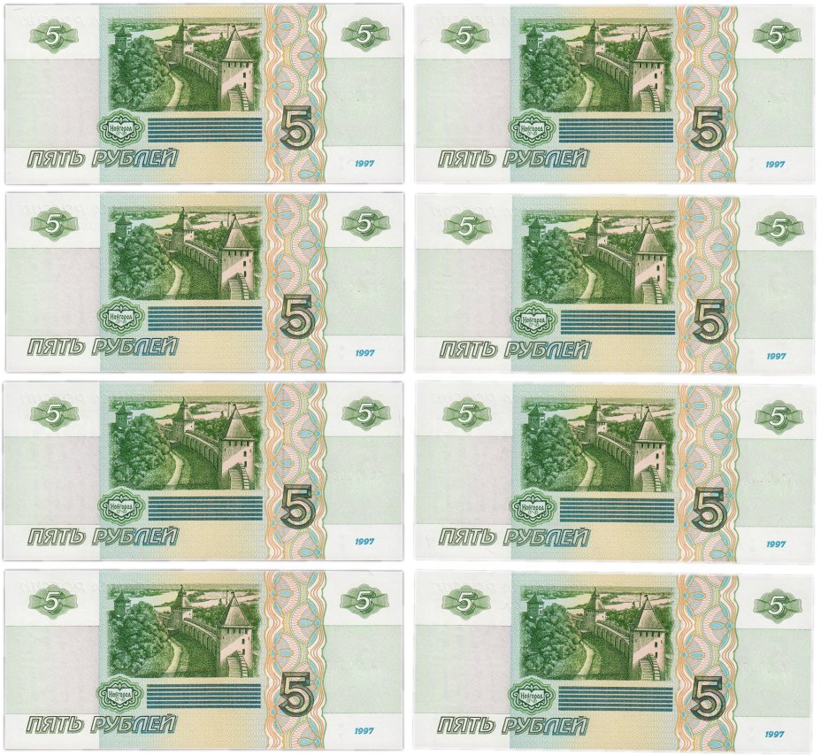 Реже других встречаются бумажные 5 рублей. Выпуск денежных знаков такого достоинства прекратился в 1999 году. Стоимость других купюр образца 1997 года зависит от года модификации (2001, 2004 и 2004), серии замещения, комбинации букв и номера. Например, некоторые экземпляры без надписи о модификации стоят в 50 раз дороже номинала (и больше, если они не участвовали в обращении). Буквосочетания, которые вызывают повышенный интерес у коллекционеров: