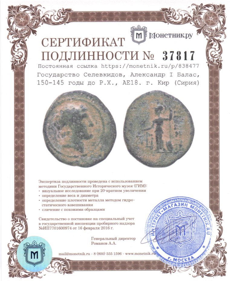 Реверс: KYPPHΣTΩN /ΔΞP, Афина, стоящая влево, в протянутой правой руке держит Нику, правой опирается на стоящий на земле у ног щит и держит копьё, слева монограмма; ΔΞP (= год 164 = 149/48 до н.э.).