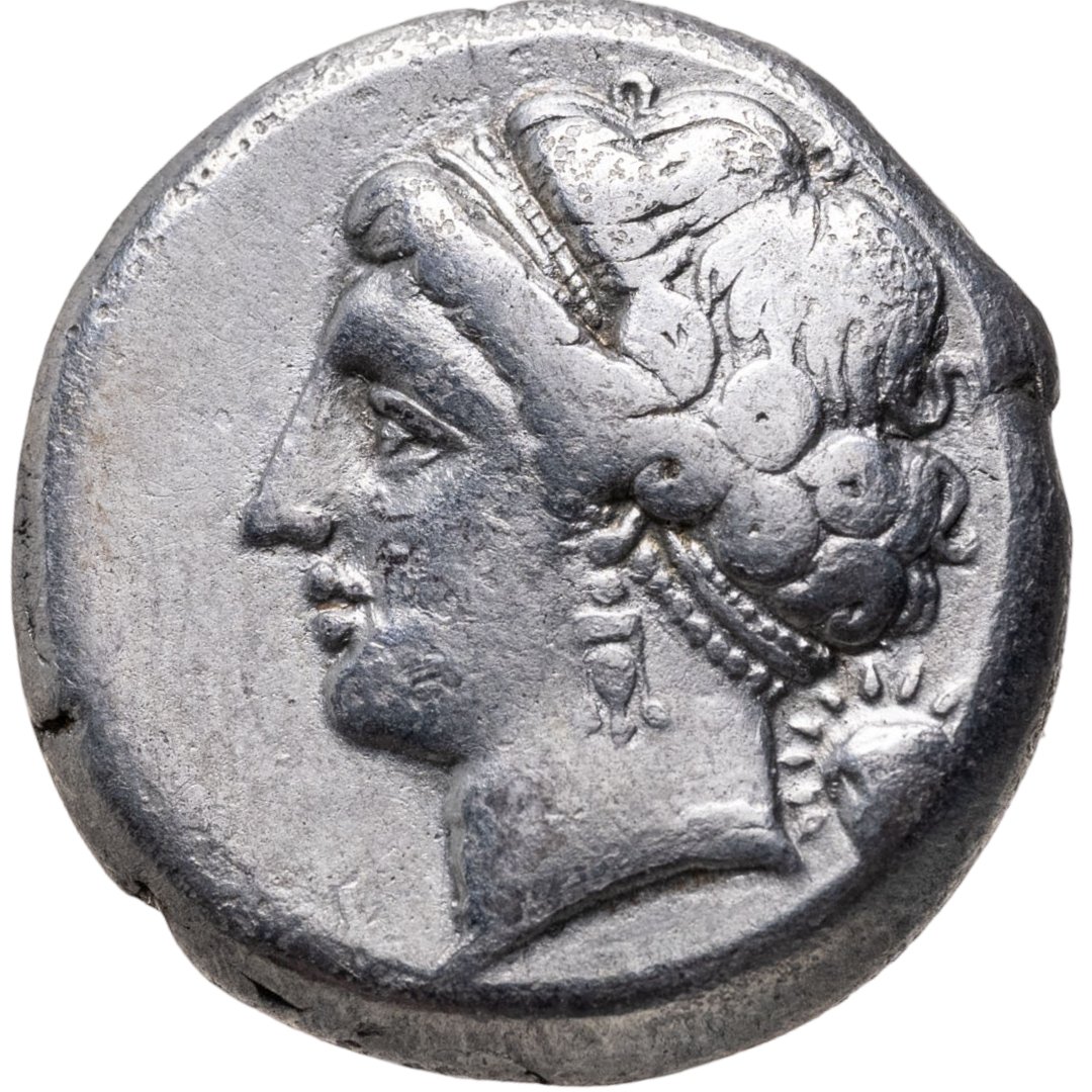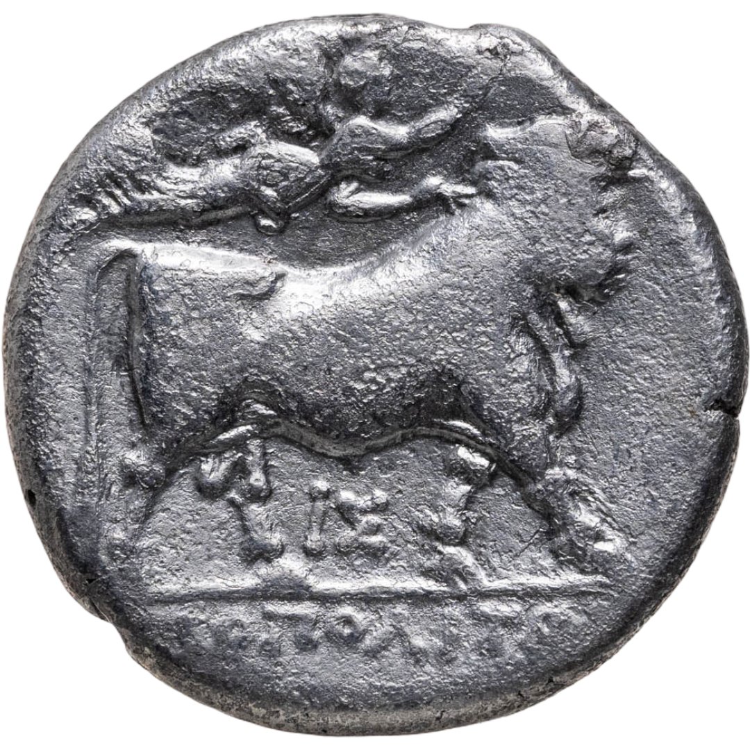 Аверс: голова нимфы Парфенопы в диадеме, повёрнутая влево, справа голова Гелиоса анфас.
