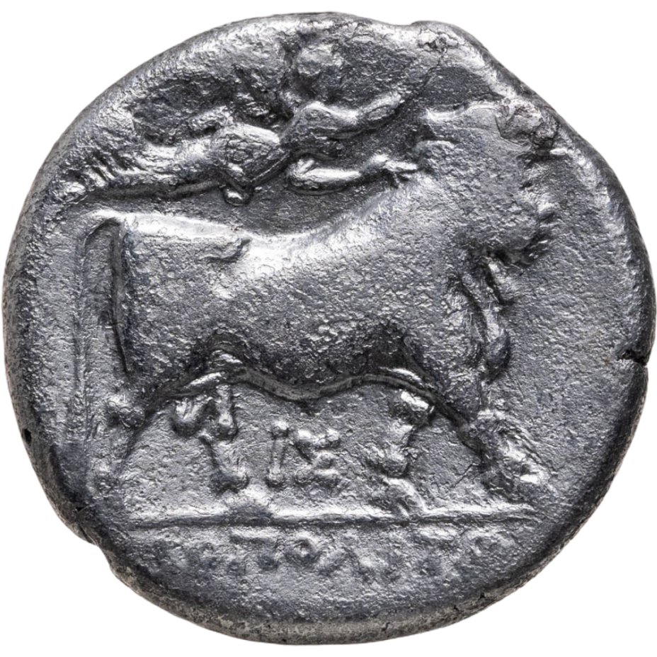 Реверс: бог реки Ахелой в виде быка с человеческим лицом, идущий вправо, над ним летящая Виктория, возлагающая на голову быка венок, над обрезом литеры ΙΣ, под обрезом ΝΕΟΠΟΛΙΤΩΝ.