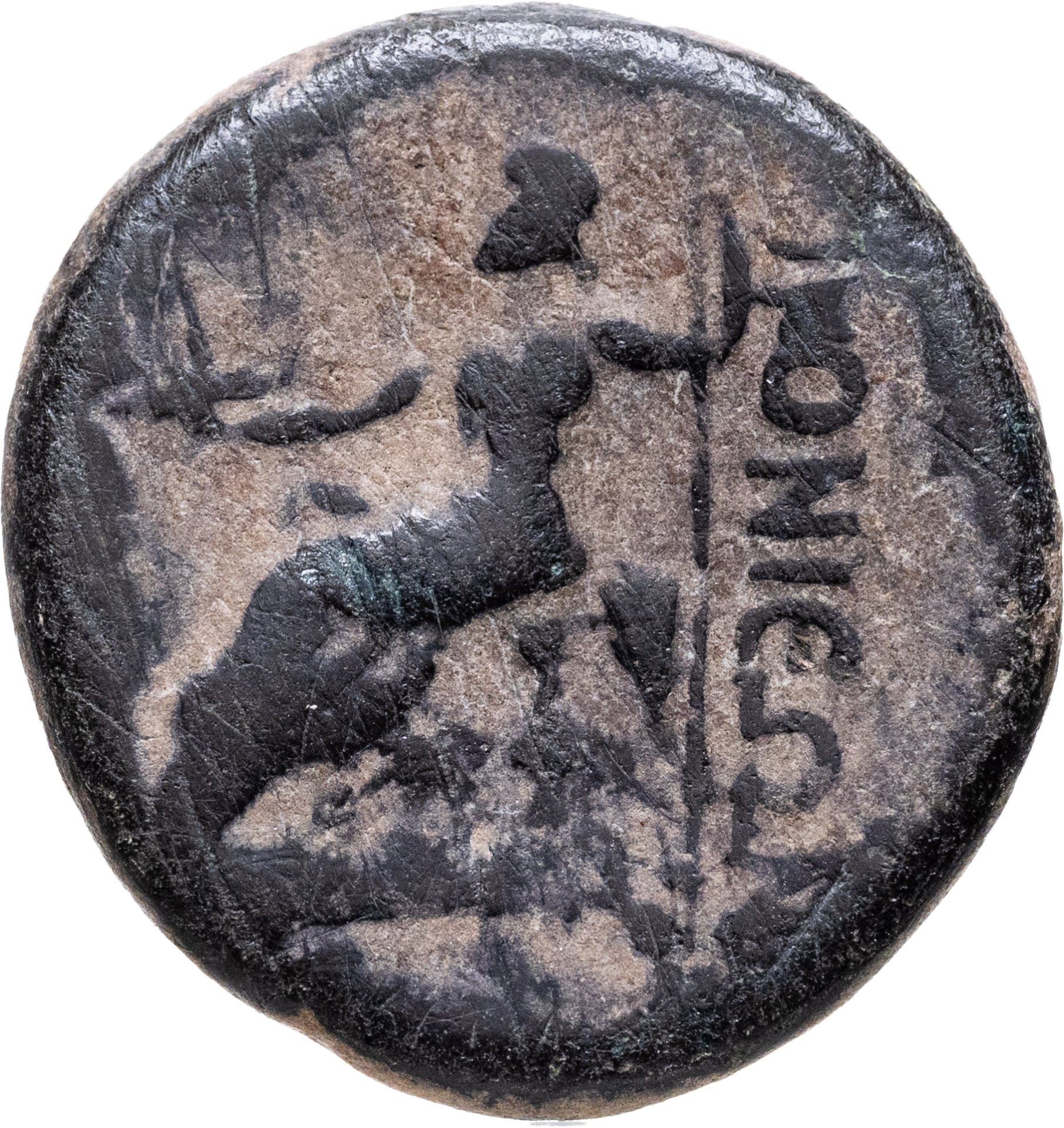 Реверс: ЄΙΚΟΝΙЄΩΝ, Зевс, сидящий на троне влево, в правой руке пучок молний, левой опирается на скипетр.