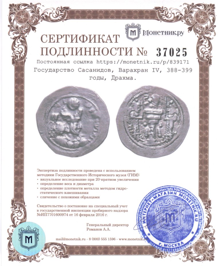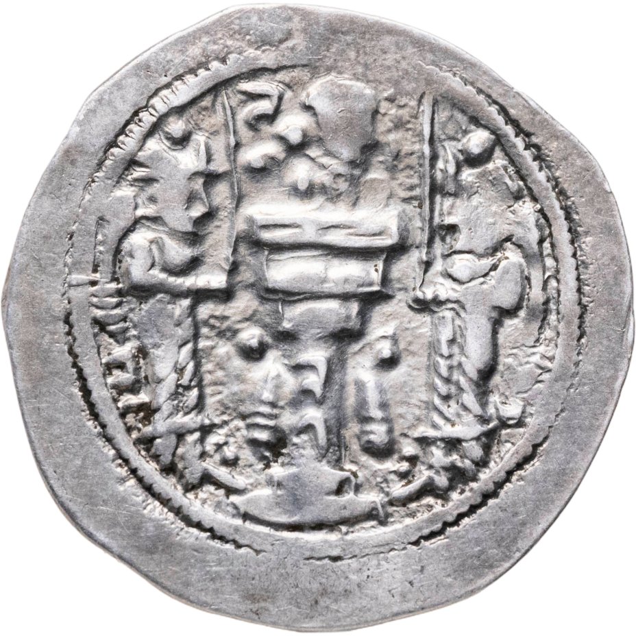 Реверс: два огнепоклонника, стоящие лицом друг к другу вокруг аташдана, увенчанного горящим бюстом Ахуры Мазды, держа перед собой обнажённые мечи остриём вверх.