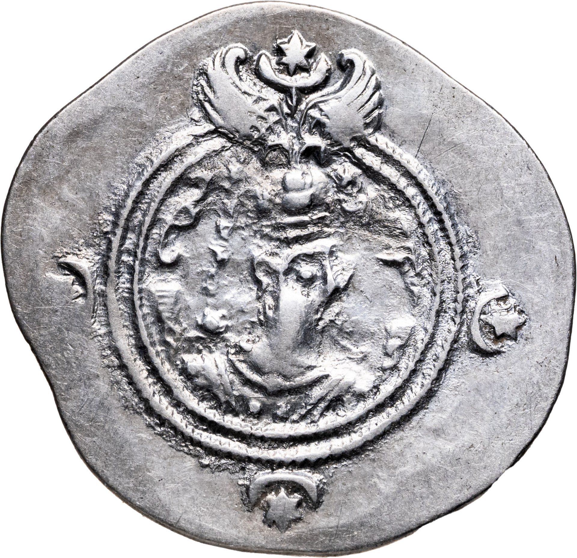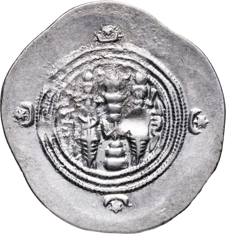 Реверс: два огнепоклонника, стоящие анфас вокруг аташдана, горящего алтаря, обеими руками опираются о мечи.