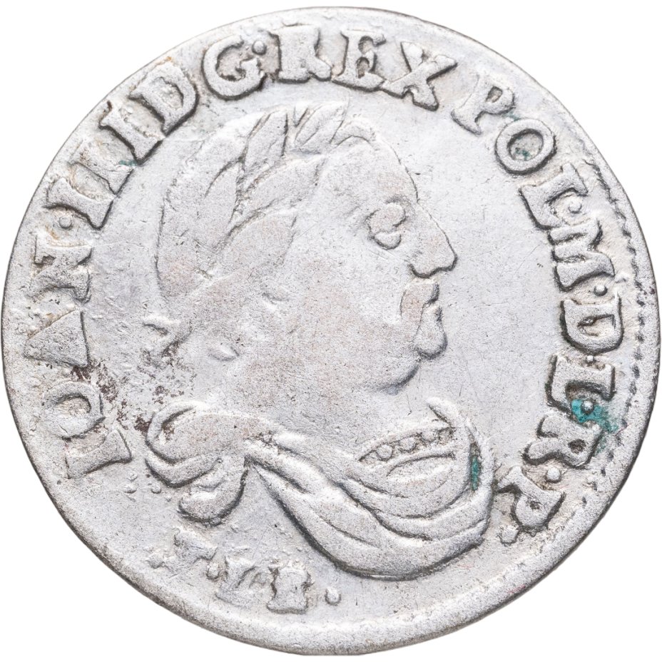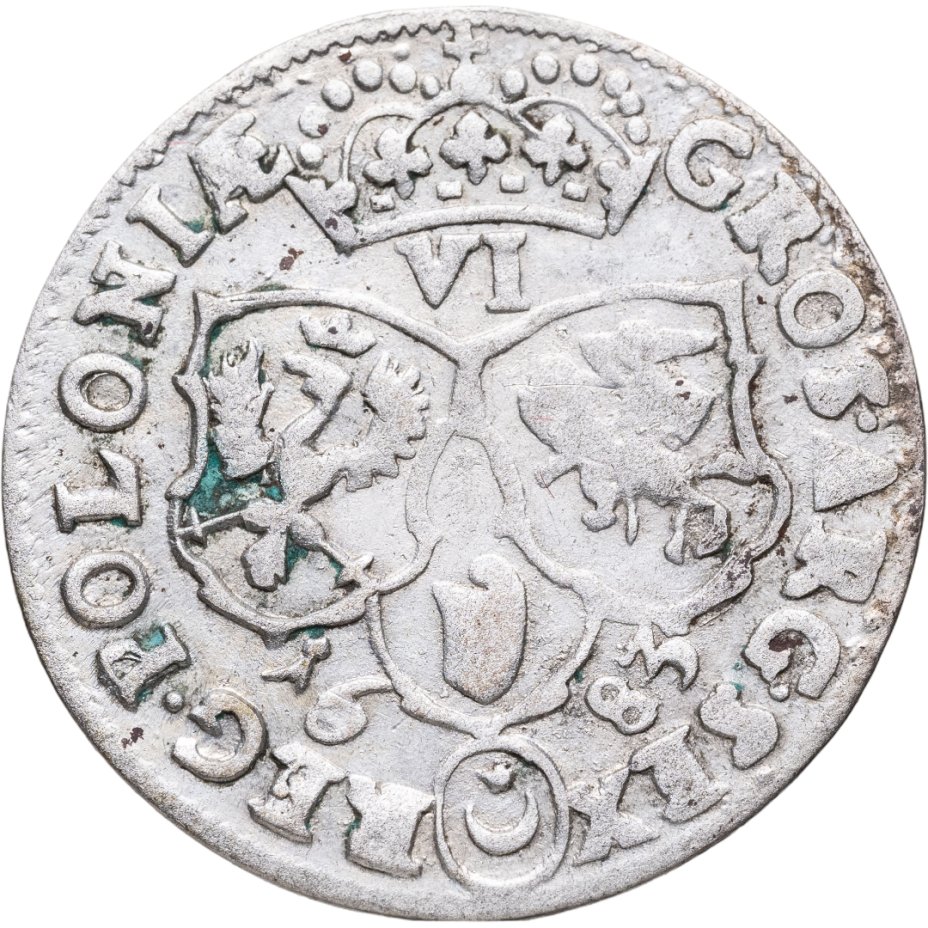 В центре - пятипольный гербовый щит с серединным щитом, увенчаный короной. На среднем щите помещен герб династии Ваза -Сноп. В остальных щитах по два герба Королевства Польши и Литвы. Под щитом цифра "3" в щите, определяющая номинал монеты - 3 полугроша.