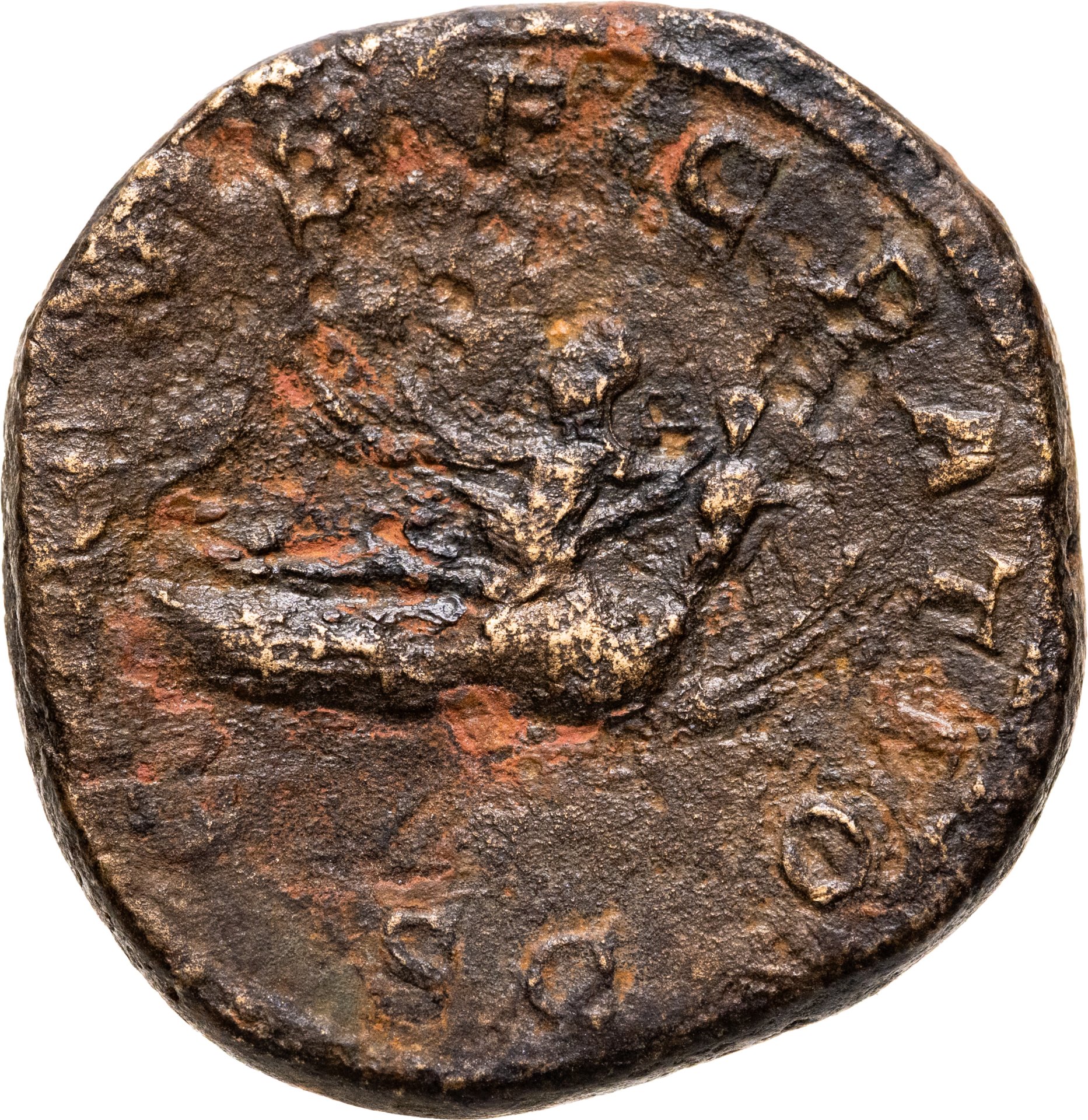 Реверс: CONSECRATIO, императрица, сидящая верхом на павлине, улетающем вверх, через поле SC..