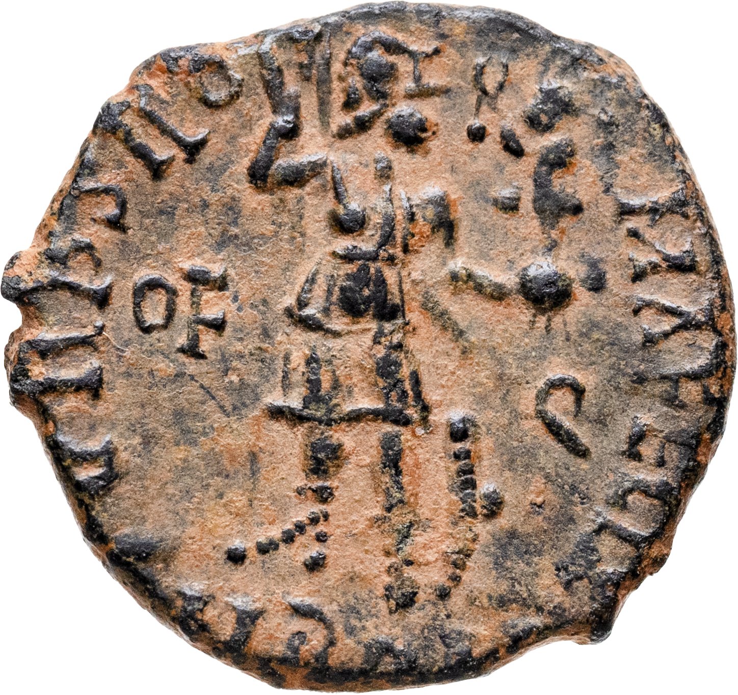 Реверс: VRBS ROMA FELIX, Рома, стоящая анфас, голова повёрнута вправо, правой рукой опирается на штандарт, в левой держит Викторию на земном шаре, справа у ног щит, через поле OF-P; под обрезом SMROM.