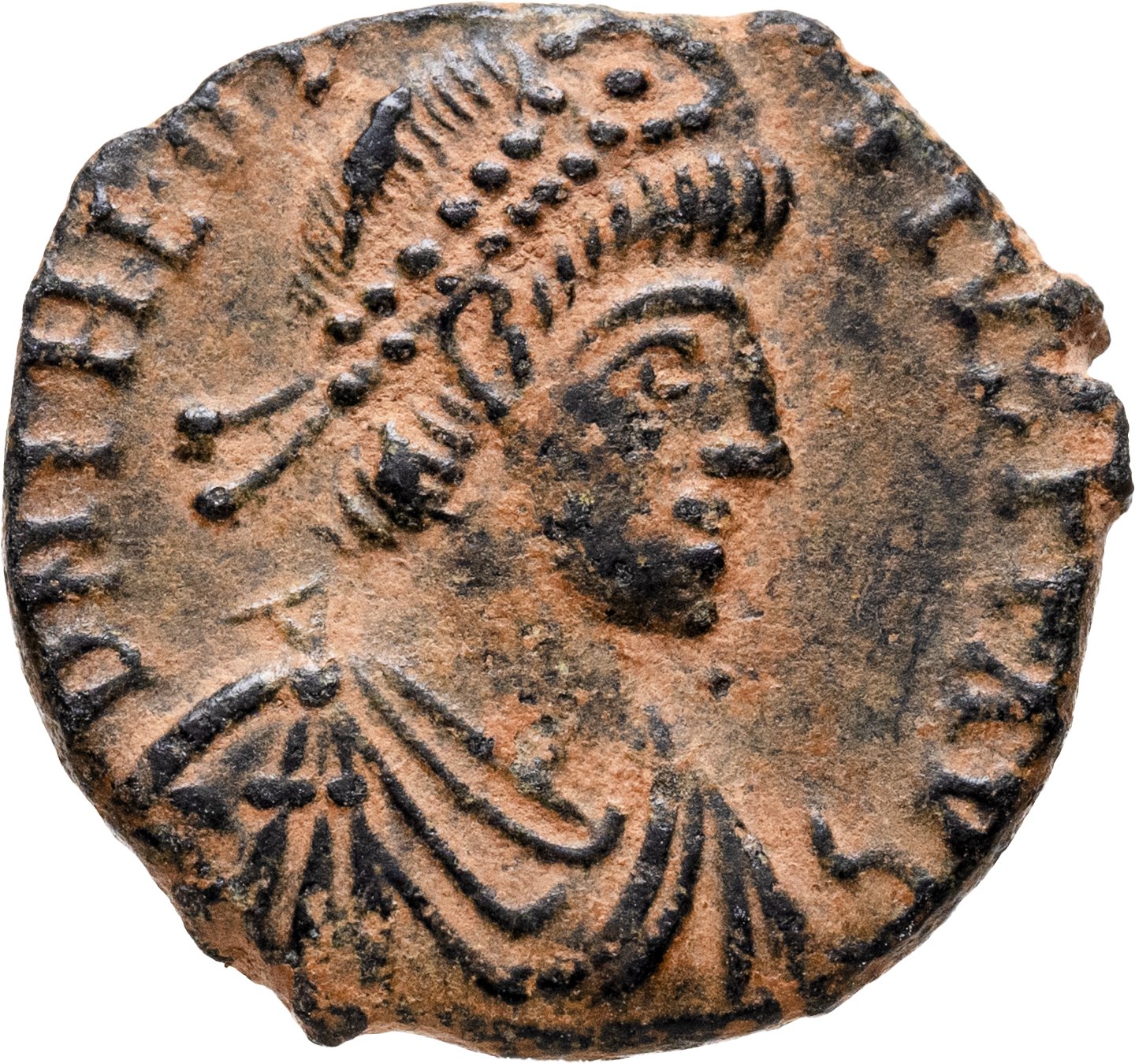 Аверс: DN THEODOSIVS P F AVG, бюст императора в лавровом венке и в доспехах, повёрнутый вправо.