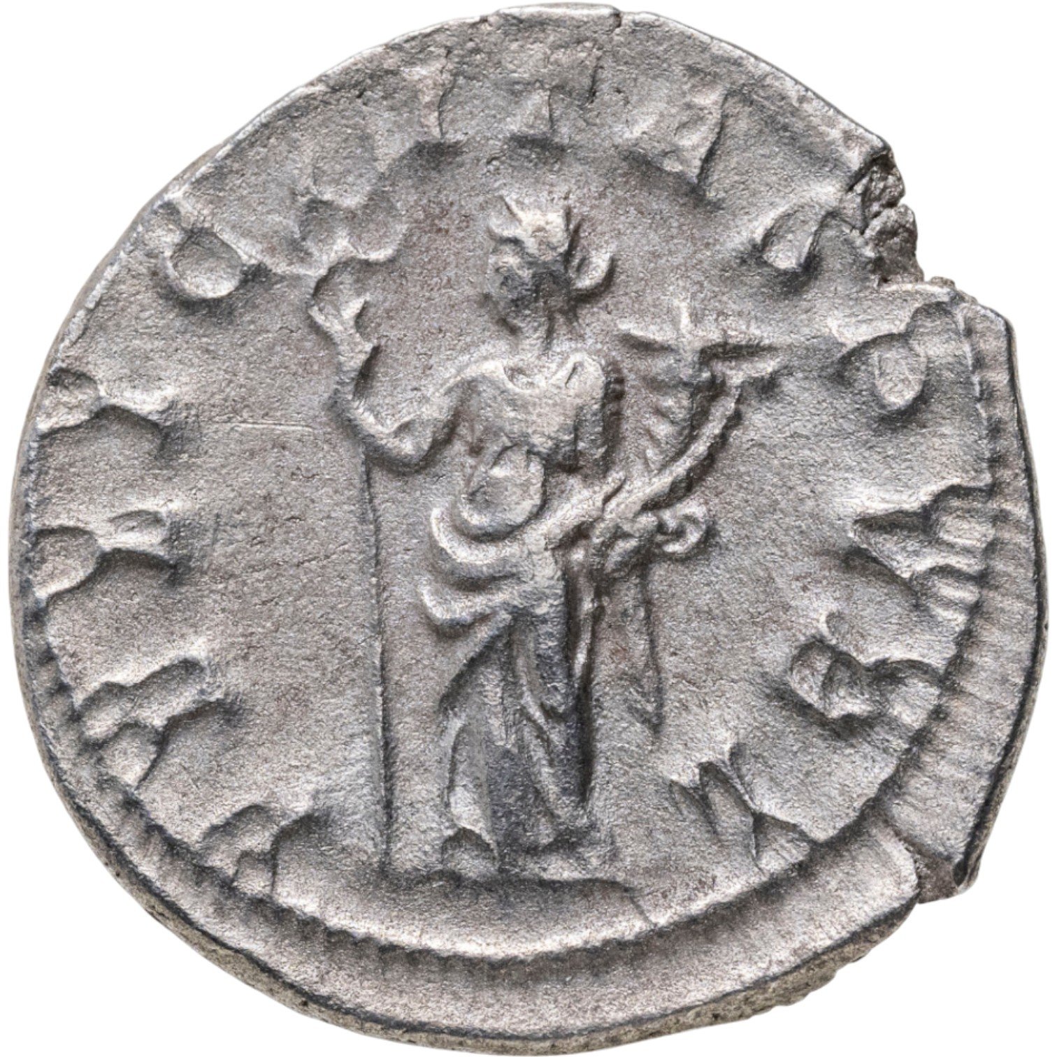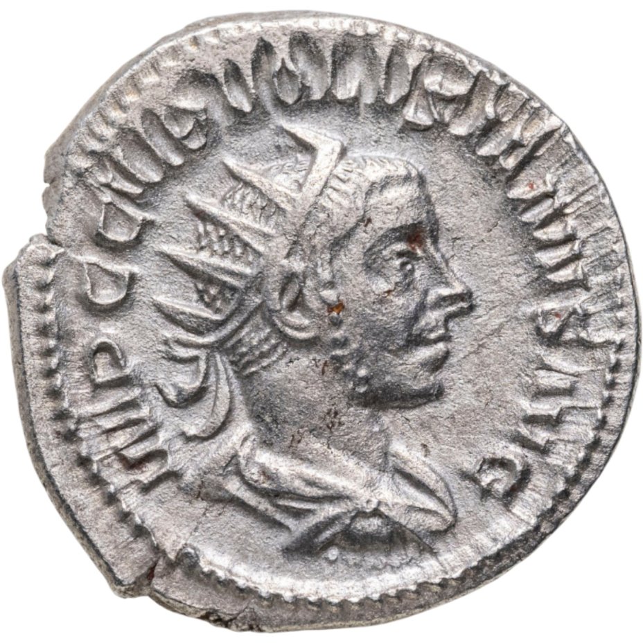 Аверс: IMP C C VIB VOLVSIANVS AVG, драпированный бюст императора в солярном венке, повернутый вправо.