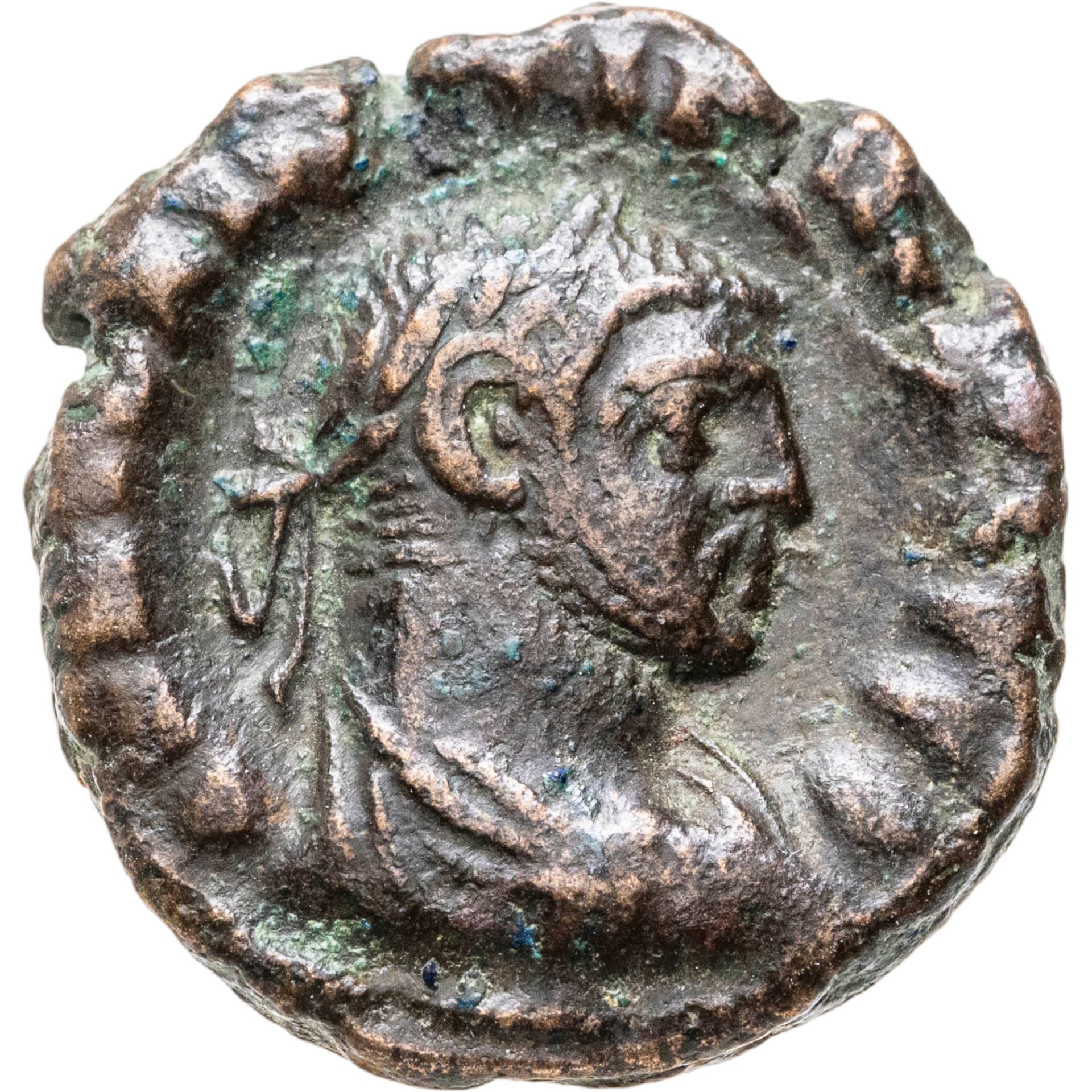 Аверс: A K M A OYA ΜΑΞΙΜΙΑΝΟC CЄΒ, драпированный бюст императора в лавровом венке, повёрнутый вправо.
