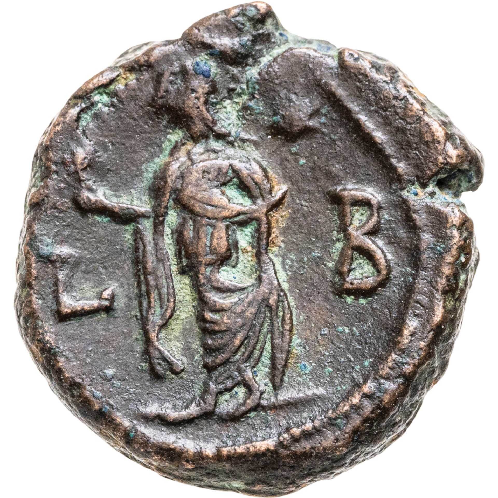 Реверс: Элпида, персонификация Надежды, идущая влево, в правой руке держит цветок, левой придерживает полу одежды; через поле дата LВ (2 год правления).