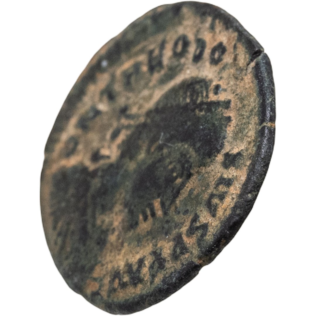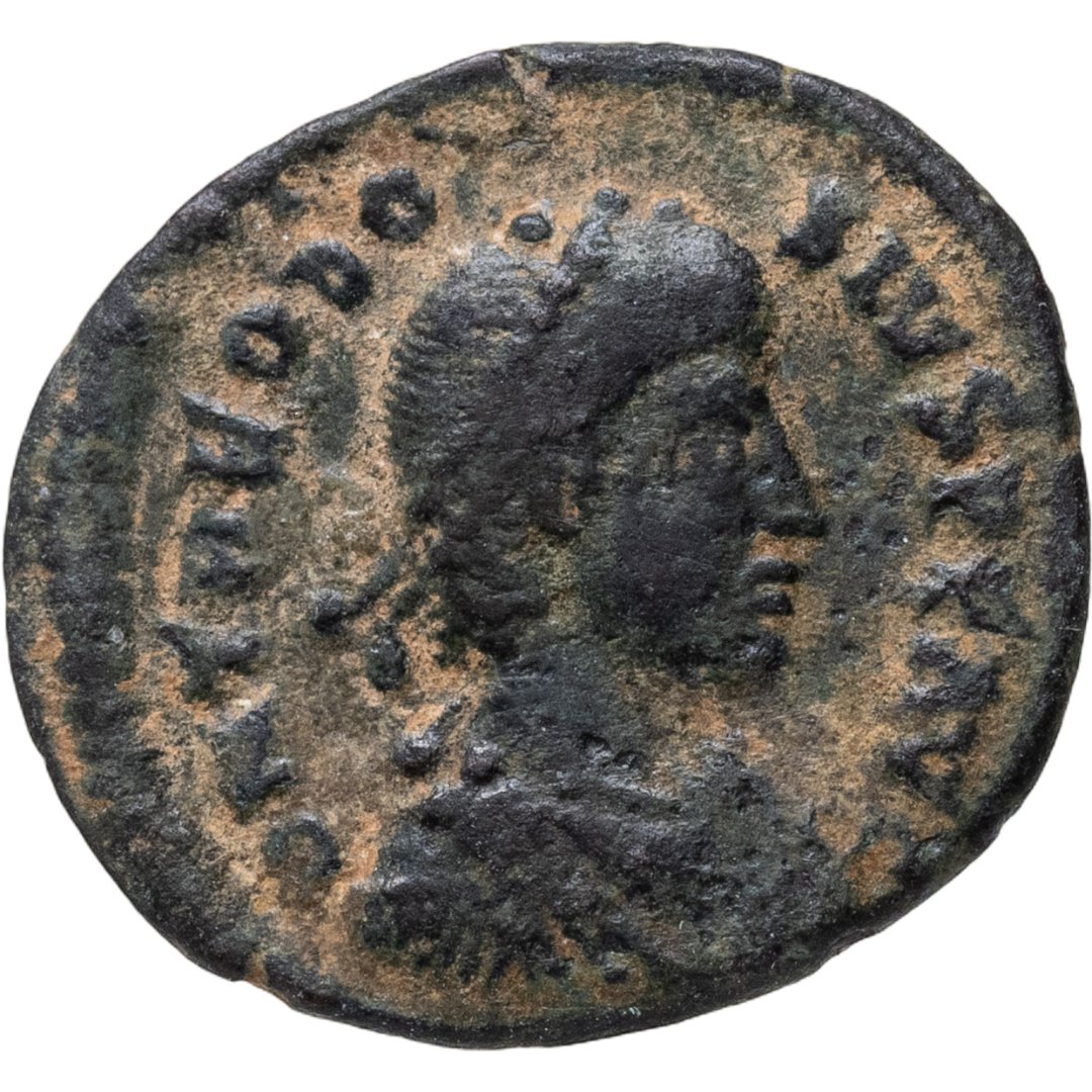Аверс: DN THEODOSIVS PF AVG, бюст императора в лавровом венке и в доспехах, повёрнутый вправо.