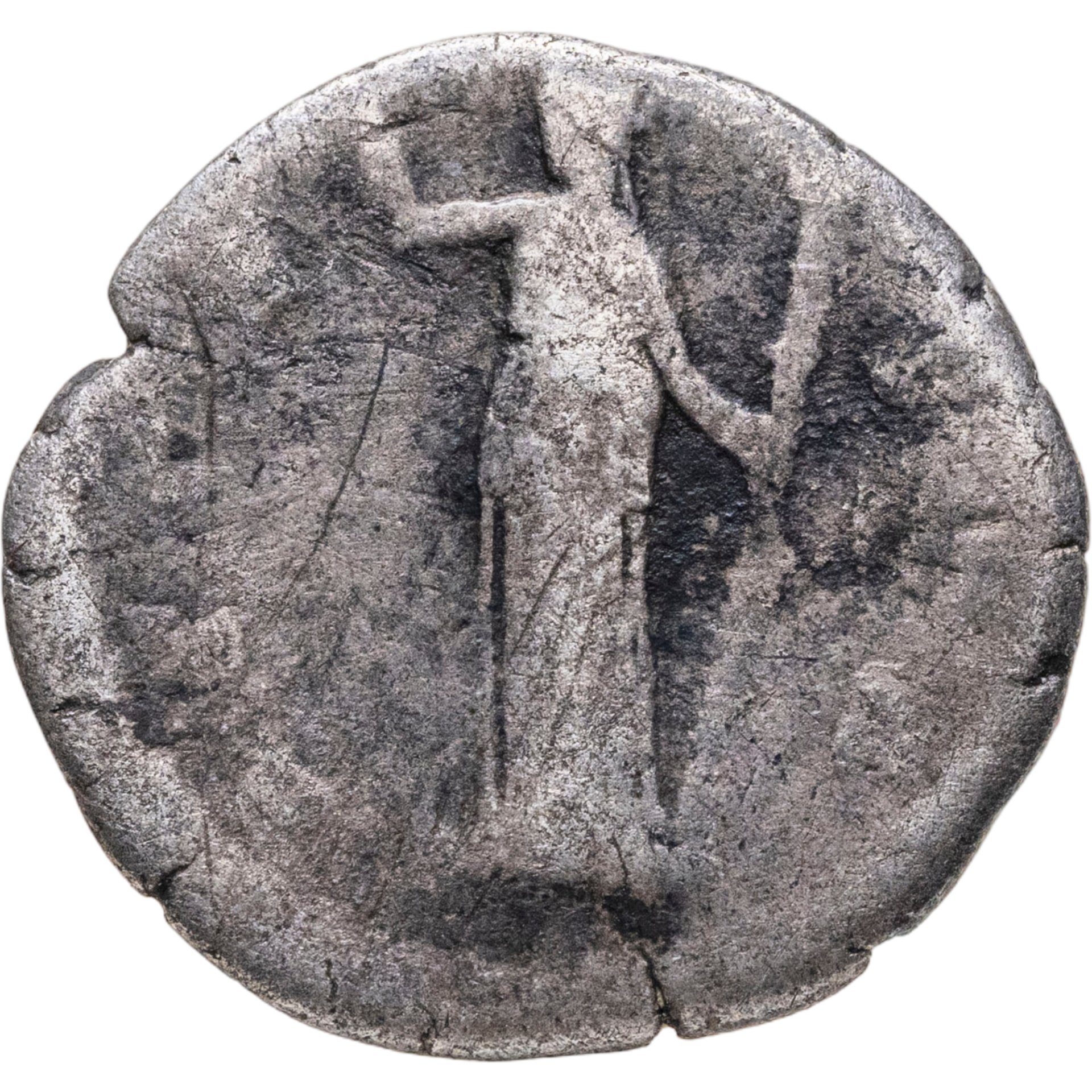 Реверс: COS IIII, Аннона, персонификация Хлебного снабжения, стоящая анфас, голова повёрнута влево, в правой рукой держит пучок хлебных колосьев, левой рукой опирается на модий, стоящий на корме корабля.