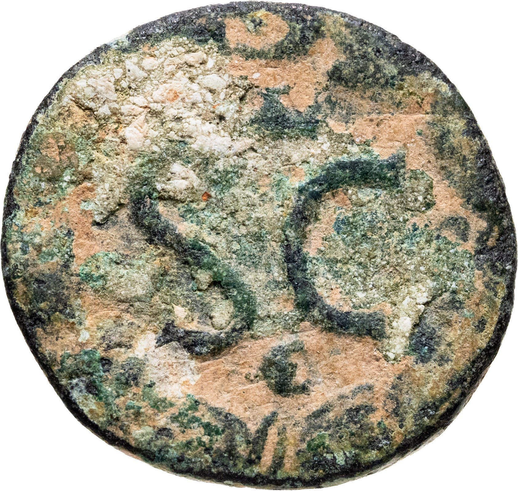 Реверс: литеры SC, сверху литера Δ, внизу литера Є, всё изображение внутри лаврового венка.