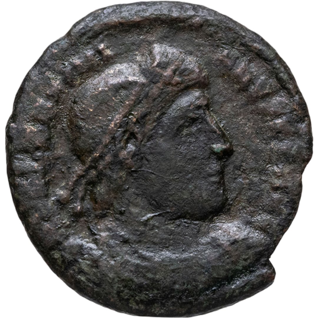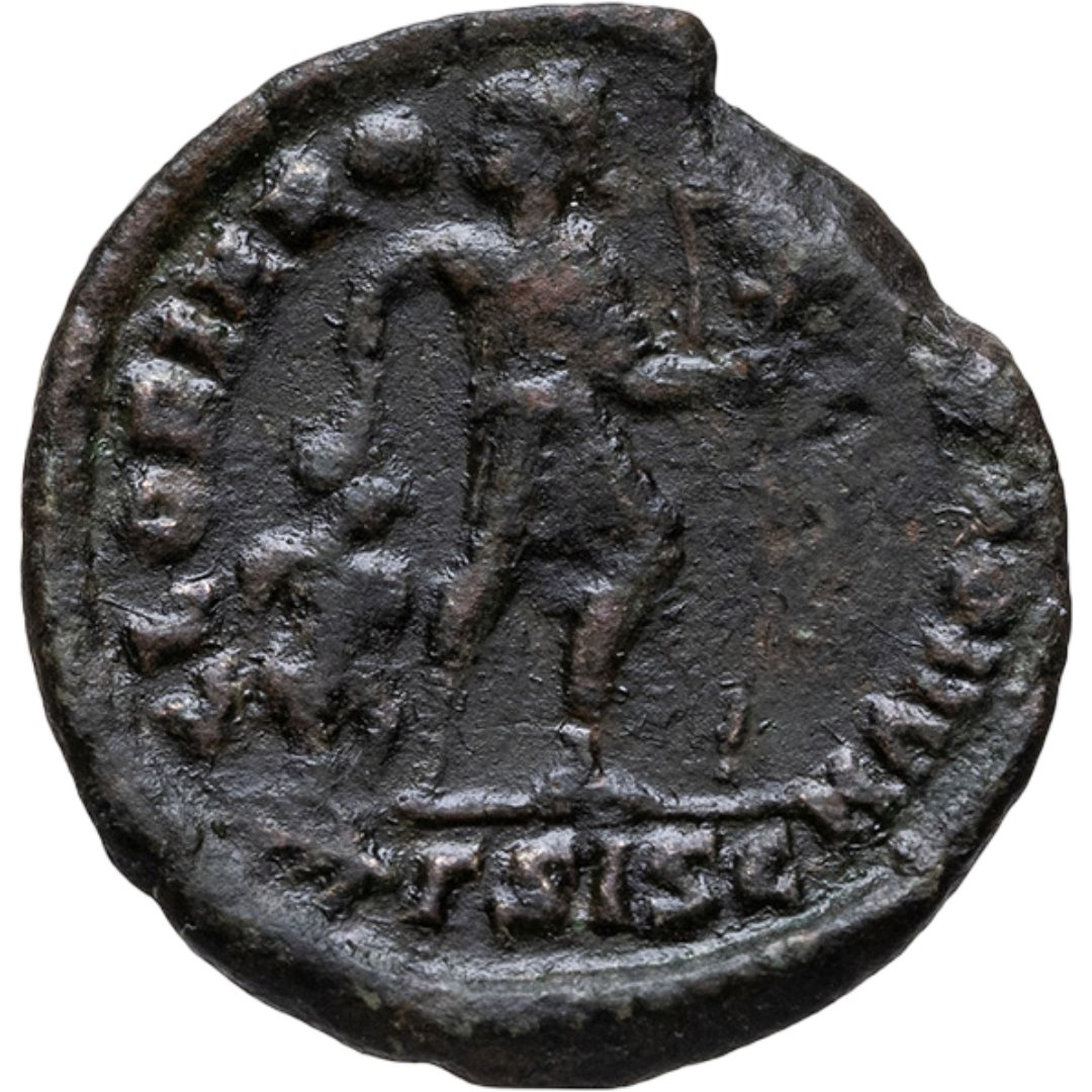 Аверс: DN VALENTINIANVS P F AVG, драпированный бюст императора в диадеме поверх военного шлема, повёрнутый вправо, в левой руке держит щит, в правой копьё.