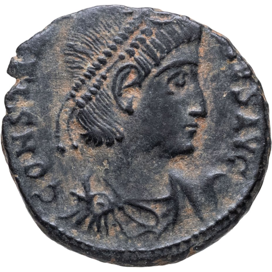 Аверс: D N CONSTANTIVS P F AVG; драпированный бюст императора в жемчужной диадеме, повернутый вправо
