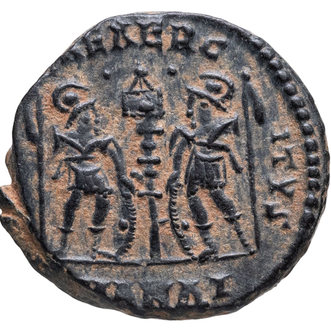 Реверс: GLORIA EXERCITVS; два воина стоят лицом друг к другу, каждый держит копье и опирается на щит, стоящий на земле; между ними штандарт; под обрезом – SMAN ΔI