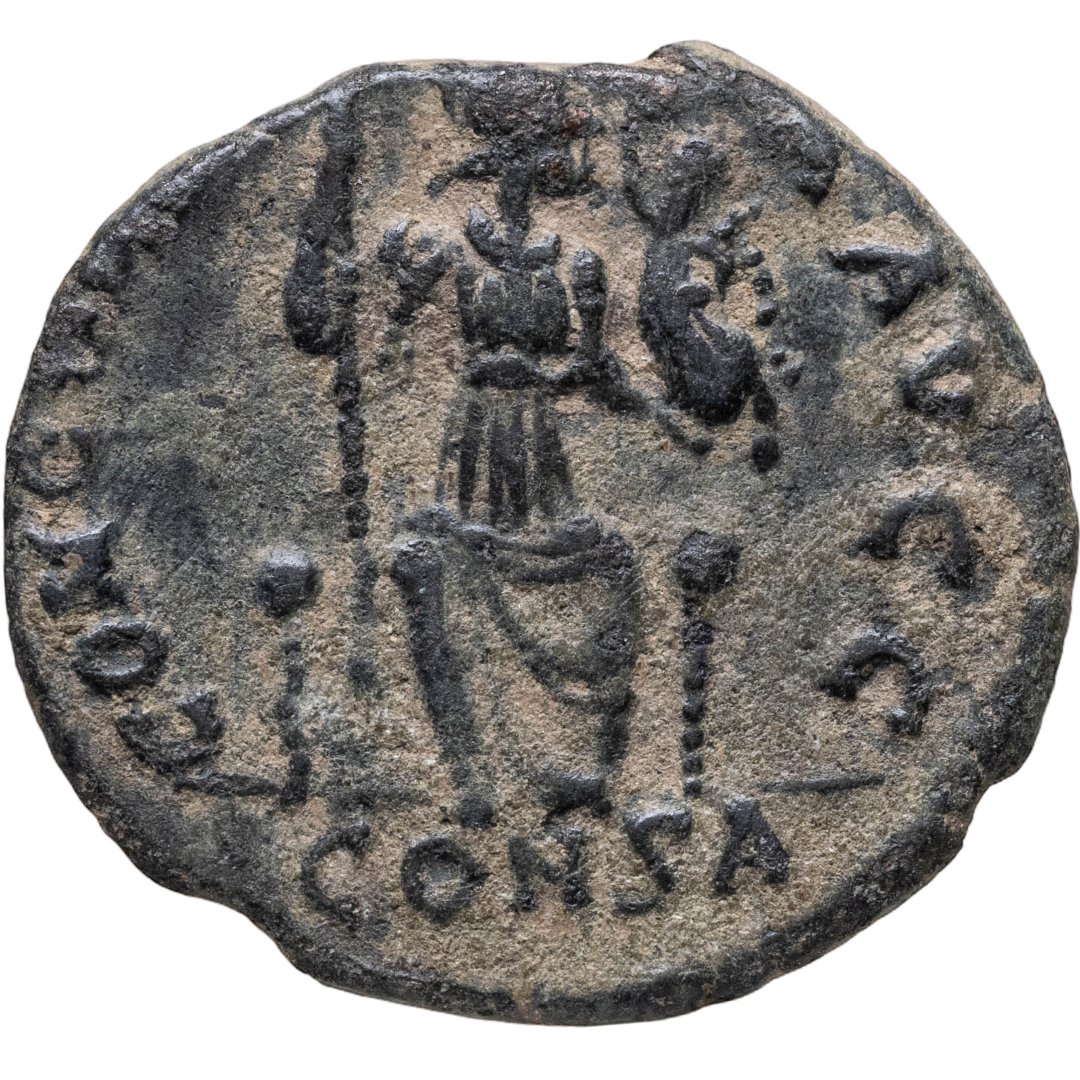 Реверс: CONCORDIA AVGG; персонификация Константинополя сидит на троне; одной рукой опирается на копье, в другой держит державу с Никой; под обрезом надпись CONSA