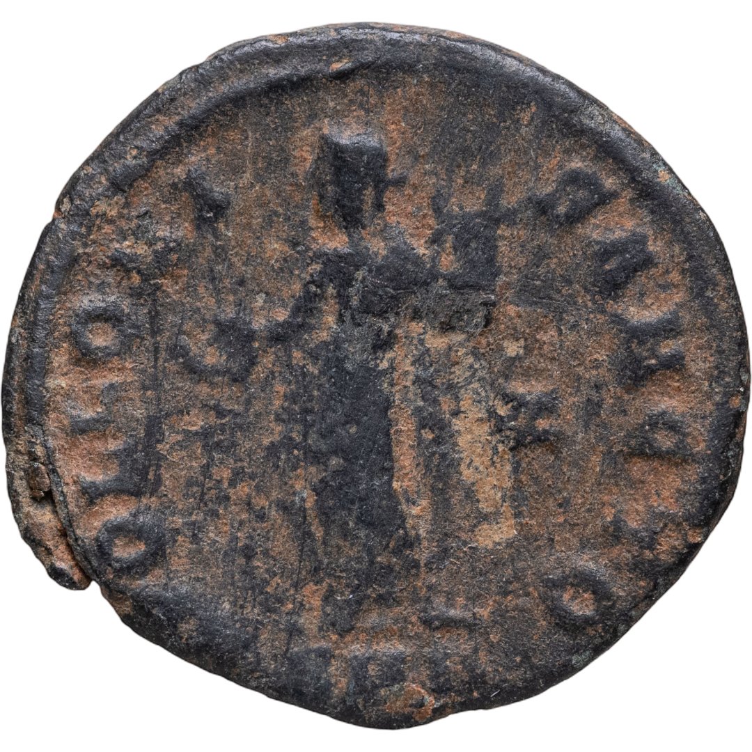 Аверс: GENIO AN-TIOCHENI; изображение сидящей Тюхе (персонификация Антиохии) в анфас, под ней юноша - олицетворение реки Оронт, на берегу которого расположен город.