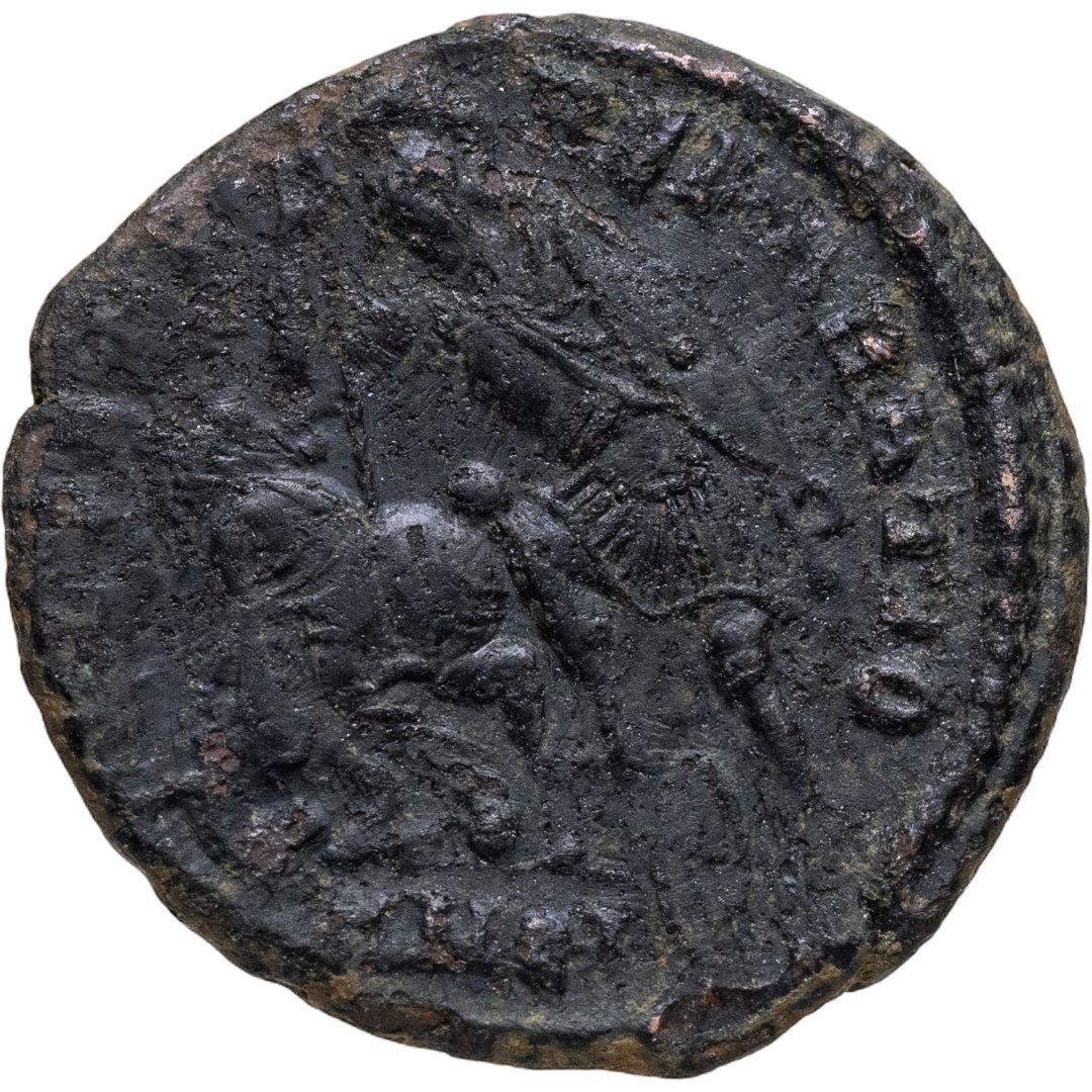 Реверс: FEL TEMP REPARATIO: воин, в шлеме, со щитом в левой руке, поражает копьем падающего всадника слева, щит которого лежит на земле справа. Всадник в остроконечном шлеме обернулся лицом к атакующему, простирая левую руку. Под обрезом буквы R-P(?), разделенные пальмовой ветвью