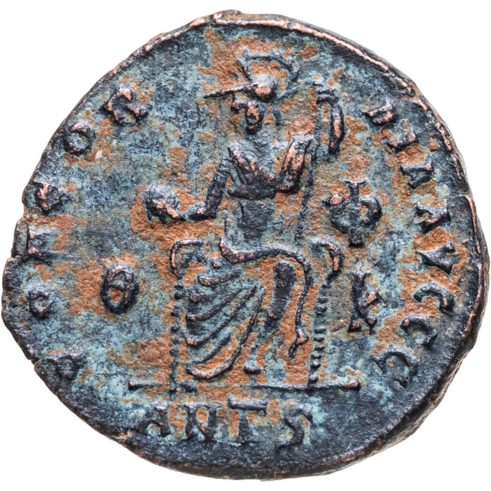 Реверс: CONCORDIA AVGG, Рома, сидящая на троне анфас, голова повёрнута влево, в правой руке держит земной шар, левой рукой опирается на скипетр, слева на поле литера Θ, справа Ф/Κ, под обрезом ANT S.