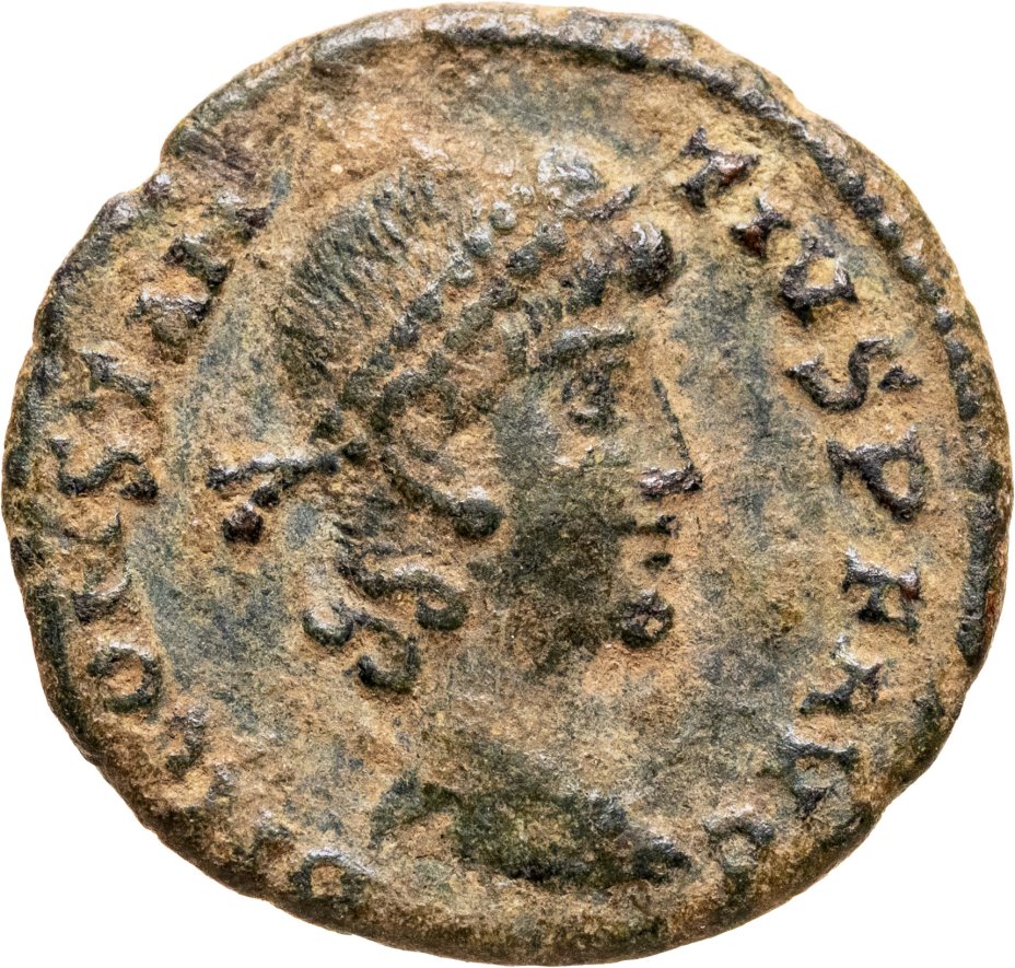 Аверс: DN CONSTANTIVS PF AVG, голова императора в диадеме, повёрнутая вправо.