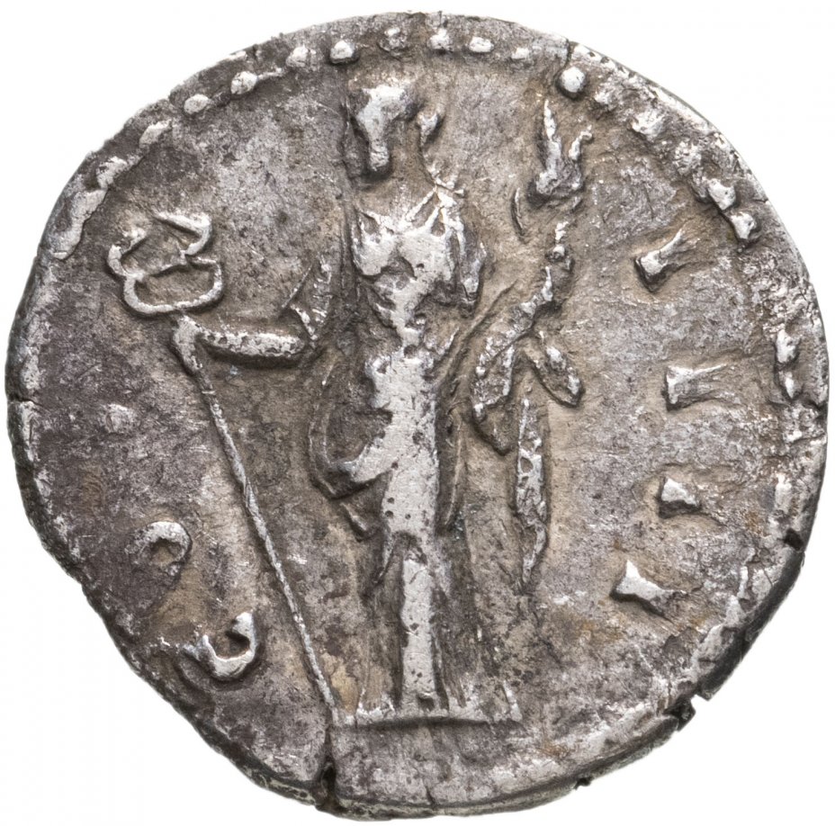 Реверс: COS IIII, Фелицитата, персонификация Счастья, стоящая влево, правой рукой опирается на длинный кадуцей, в левой руке держит рог изобилия.